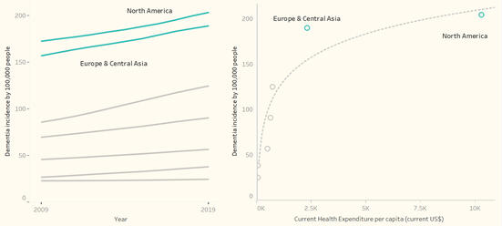 Moreover, when comparing Health Expenditure per capita and Dementia incidence we can see that, counterintuitively, the more health expenditure the higher the Dementia incidence.Skills used: